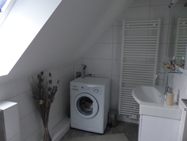 Im Bad mit Tageslicht steht eine Waschmaschine für die kleine Wäsche.