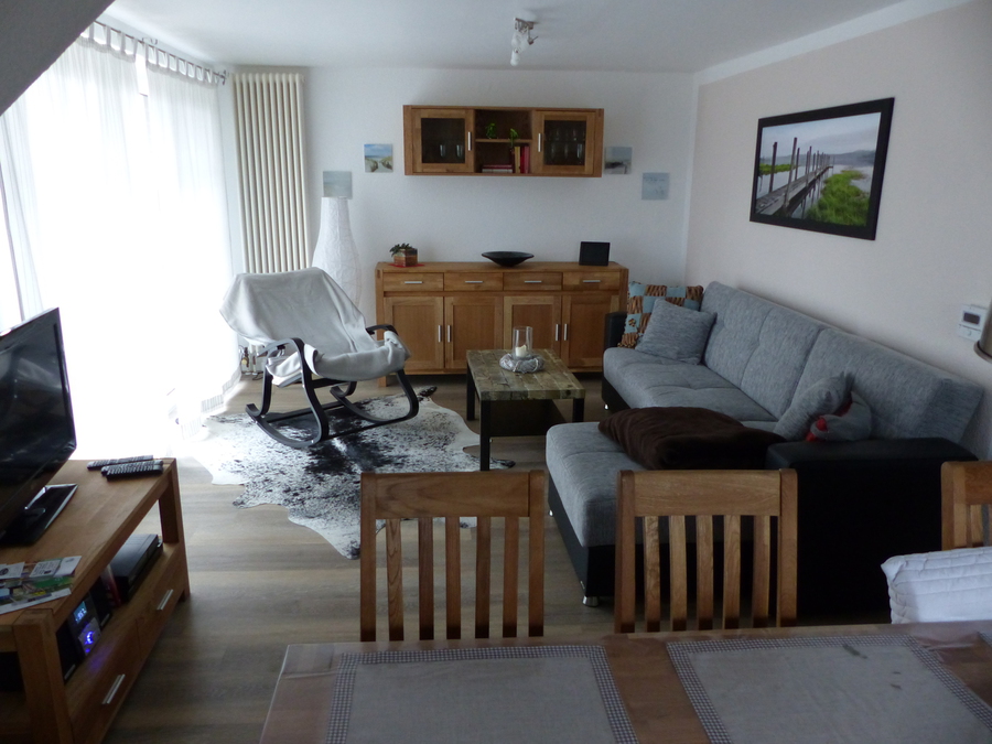 Der Wohn-,Essbereich verfügt über eine gemütliche Sitzgarnitur. Fernseher, DVD-Player und Wlan können hier genutzt werden. Am großen Esstisch finden Alle genug Platz und für den kleinsten Gast steht ein Hochstuhl (im Spitzboden) bereit!